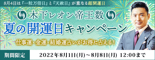 フジテレビ系列で放送中の占い番組『突然ですが占ってもいいですか?』で人気を博している木下レオン。ただいま、月額公式サイト『木下レオン◆帝王数』にて、『木下レオン帝王数 夏の開運日キャンペーン』を公開中です。期間中、仕事運・金運・結婚運をまとめてお得に占える総合鑑定が新しくリリースされます。ぜひこの機会にお試しください。
