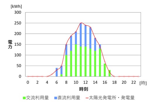 本年4月に開始した実証運転では,現在までに,発電した電力すべてを有効利用し,安定的に運用できることを確認しています。具体的には,6月の電力利用実績は交流電力で23,160kWh,直流電力で11,860kWhでした。また,1日の電力利用状況の例を図2に示します。一般的なシステムで利用可能な定格200kWを超え,最大で250kWの電力を利用できている時間帯があることが分かります。