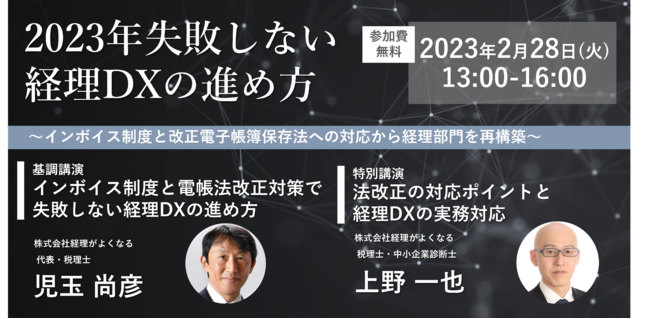 株式会社TOKIUM(本社:東京都中央区、代表取締役:黒崎 賢一、以下「TOKIUM」)は、2023年2月28日(火)に開催される、「2023年失敗しない経理DXの進め方」内のオンラインセミナーに登壇することをお知らせします。「2023年失敗しない経理DXの進め方」では、令和5年度税制改正大綱を踏まえて、改正電子帳簿保存法(以下、電帳法)やインボイス制度の導入など、急務となった経理業務のデジタル化をどう進めるかを専門家が解説します。