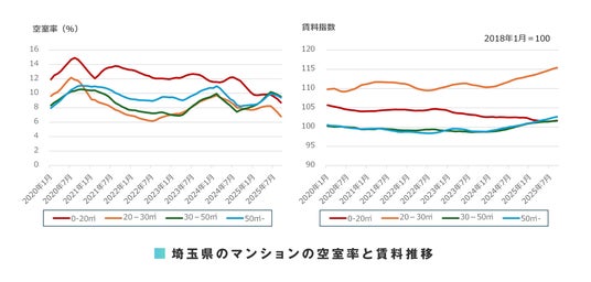 さいたま市では、カップル向け(30-50平方メートル )、家族向け(50平方メートル -)の空室率の悪化が継続しています。埼玉県では東京23区に比較して新築・中古マンションの価格が低いことから、ローンの返済金額に比較してこれらの面積帯の賃貸住宅の支払い家賃が割高とみられている可能性があります。空室率は全面積帯で弱含んでおり、市場が供給過剰気味になっていることをうかがわせます。