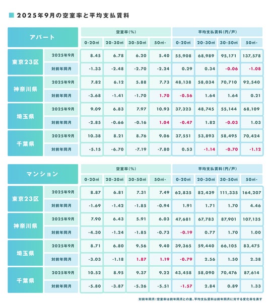 ■2025年9月の空室率と平均支払賃料および前年同月比