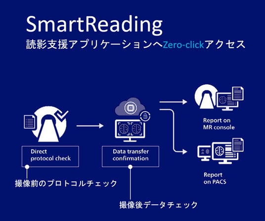 「SmartReading」は、クラウド型のAI読影支援ソフトウェアへゼロクリックでアクセスできる新しいプラットフォームです。MR操作コンソール上でAI読影支援ソフトウェアと連携[4]できることで、撮像前にプロトコルを自動チェックし、撮像条件の変更による定量情報への影響を回避するとともに、常に最新の診療ガイドラインに準拠した撮像を可能にします。撮像後は、連携したAI読影支援ソフトウェアへ撮像データの送信を行い、解析された結果がPACSや操作コンソールに送信されます。これによりレポートの標準化と診断精度の均一化をサポートします。