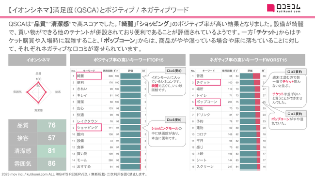 それらのAI解析を用いた分析例として「イオンシネマ」のQSCA・頻出ポジネガキーワードを確認しました。
