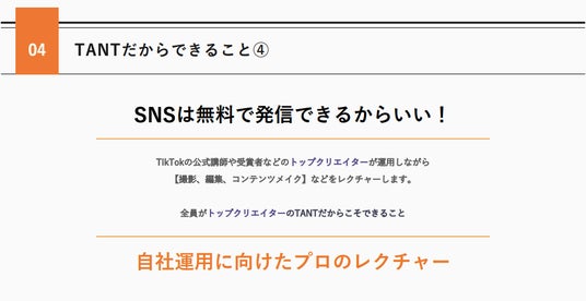 「TANT」は、フォロワー15万人以上のインフルエンサーが所属するTikTokコンサルティングチームです。SNSマーケティングを実施したい顧客のニーズや目標を詳しくヒアリングし、それに基づいて適切なインフルエンサーを選定します。 ファン獲得のプロフェッショナルであるインフルエンサーがコンサルタントになることで、顧客の課題を解決するコンテンツの提案が可能。顧客のSNS運用からデータ分析まで総合的にサポートします。