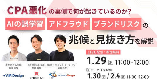 株式会社Spider Labs(本社:東京都港区、代表取締役:大月 聡子、以下「Spider Labs」)は、株式会社インティメート・マージャー、株式会社ガラパゴスと共催で、無料オンラインウェビナー「CPA悪化の裏側で何が起きているのか? AIの誤学習・アドフラウド・ブランドリスクの兆候と見抜き方」を、2026年1月29日(水)に開催いたします。