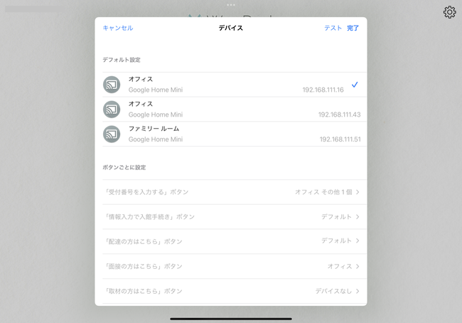 今回のバージョンアップ以降は、各ボタンにどのスピーカーを鳴らすのかを個別に設定することができるようになり、例えば営業部宛の来客の場合は営業の島に近いスマートスピーカーが鳴り、管理部宛の来客の場合は管理部の島に近いスマートスピーカーを鳴らすなど、よりメリハリの利いた音声通知が可能になります。