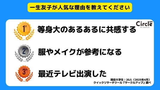 同様に票を集めた「一生友子」について、アンケートで投票した学生にその魅力を聞いたところ、「等身大のあるあるが同世代には共感できる」、「服やメイクの動画は参考になる」といった声が多く寄せられました。また昨年にはテレビ番組「マツコ会議」にも出演し、その人気は全国区に。