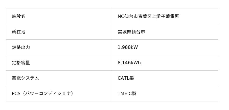 このたび、本プロジェクトの2拠点目として宮城県仙台市の系統用蓄電所「NC仙台市青葉区上愛子蓄電所」(定格出力約2MW、定格容量約8MWh)が、2026年4月1日に受電を開始しました。本蓄電所は2026年8月頃に需給調整市場への参入を予定しており、地域分散型エネルギー拠点として電力系統に調整力を提供し、電力の安定供給に貢献します。