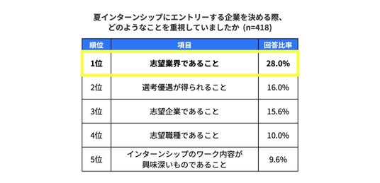 - 夏インターンシップの企業選びは「志望業界であること」を重視