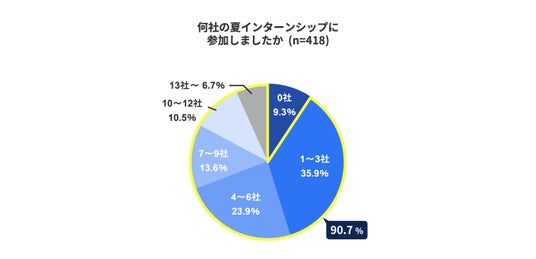 また、実際に参加した社数を尋ねると、中央値は「4社」となりました。全体で見ると、約9割の学生が夏インターンシップに参加していることがわかりました。