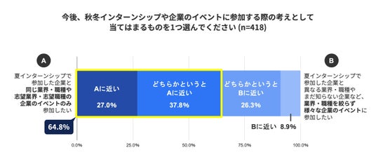 秋冬に開催されるインターンシップやイベントでは、「夏に参加した企業と同じ業界・職種や、志望する業界・職種の企業のものに参加したい」と回答した学生は全体の64.8%で、志望とは異なる業界・職種や未知の業界・職種のイベントに参加したい学生を上回りました。学生は夏インターンシップで業界・職種を選んだ後、秋以降は選択した業界・職種の情報を集めるフェーズに入ると見られます。
