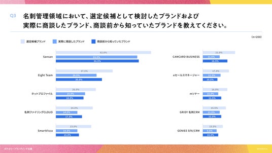 「Q3. 名刺管理領域において、選定候補として検討したブランドおよび実際に商談したブランド、商談前から知っていたブランドを教えてください。」(n=200)と質問したところ、選定候補ブランドはSansanが62.0%、実際に商談したブランドは Sansanが53.5%、商談前から知っていたブランドは Sansanが54.5%という回答となりました。