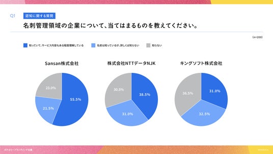 「Q1. 名刺管理領域の企業について、当てはまるものを教えてください。」(n=200)と質問したところ、「知っていて、サービス内容もある程度理解している」と回答した割合は、Sansan株式会社は55.5%、株式会社NTTデータNJKが38.5%、キングソフト株式会社が31.0%となりました。