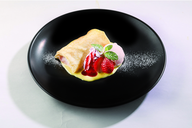 ●たっぷりクリームの苺クレープ ~アングレーズソースにのせて~ 590円(税込) ホイップクリームとカスタードホイップに新鮮な苺、さらに苺ソースを包んだクレープ。 アングレーズソースをたっぷりつけてお召し上がりください。