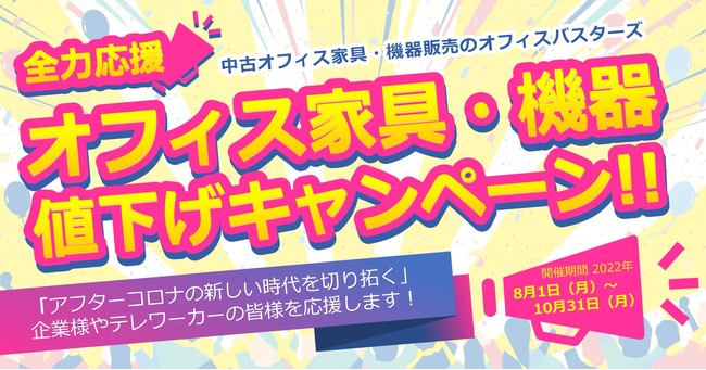 株式会社オフィスバスターズ(東京都中央区 代表取締役:熊谷 正慶 以下当社)を日頃ご愛顧いただき、誠にありがとうございます。当社では、これまで日本全国で高品質な中古オフィス家具/オフィス事務機器をリーズナブルな価格でご提供させていただいています。しかし、昨今の長引くコロナ禍や世界の様々な不安定要素から、軒並み各社が値上げを行ない、アフターコロナからの脱却と活性化に歯止めを掛けてしまう様相を呈しはじめ、当社の取り扱う中古オフィス家具/オフィス事務機器の周辺にもその影響は訪れ始めています。そこで当社では、こんな時だからこそ、より多くのお客様へより良い商品をお手軽なお値段でお届けしたいと願い「アフターコロナの新しい時代を切り拓く」中小企業様やテレワーカーの皆様を応援したく、当社商品をご購入の皆様を対象に、2022年8月1日(月)から同年10月31日(月)まで、「オフィスバスターズ 全力応援値下げ」キャンペーンを実施します。