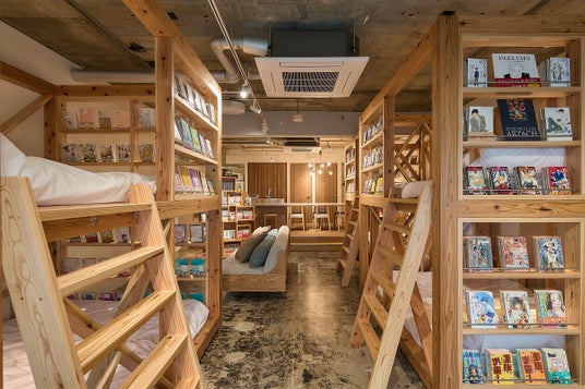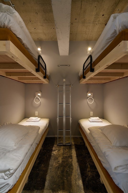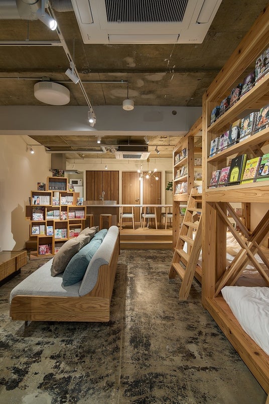 客室は、インバウンドの長期滞在やグループ滞在を意識した、暮らすように滞在できるLDK付客室としました。約60平方メートル 、天井現しにすることで確保した天井高2.8mの開放的な空間に、LDK、シャワー・洗面スペース、バンクベッドを設え、最大12名が快適に宿泊可能な客室としました。また、新しい本や漫画との出会いを促すため、ディスプレイスペースを各所に用意、内装も本や漫画が映えるシンプルな仕上げとし、ナチュラルでリラックスできる空間としました。また、1室だけの特別な客室として、寝台特急の寝台や什器等を再利用した「寝台ルーム」も計画、電車での旅気分が味わえます。
