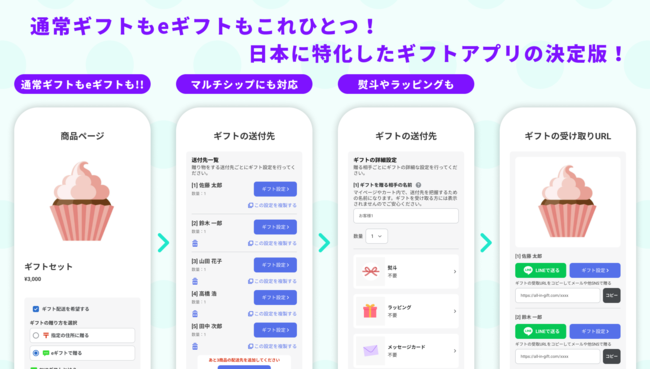 通常ギフトはもちろん、eギフトにも対応、熨斗やラッピングのオプション、複数配送(マルチシップ)、カタログギフトにも対応したギフトアプリの決定版です。 ギフトを通じて顧客との新しい出会いをつくることができ、購入率のアップにつながります。