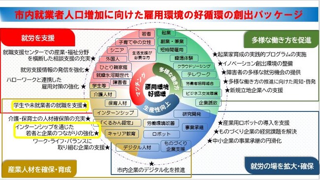 市内企業における学生のインターン受入を支援し、企業の受入にかかる負担感の削減や受入ノウハウを養成することにより、インターンシップを拡大し若者の市内就労などを図ります。