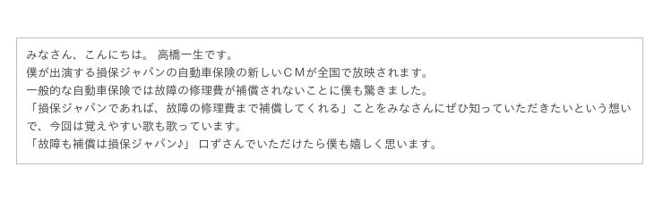 本CMでは、「一般的な自動車保険では故障の修理費は補償されない」というあまり知られていない事実をお客さまに知っていただくため、高橋一生さんがクイズや歌で表現します。「故障も補償は損保ジャパン」をキーメッセージとして、大切なお車が故障した際の修理費に備えられる当社自動車保険を多くのお客さまにお届けしたいという想いを込めて制作しています。
