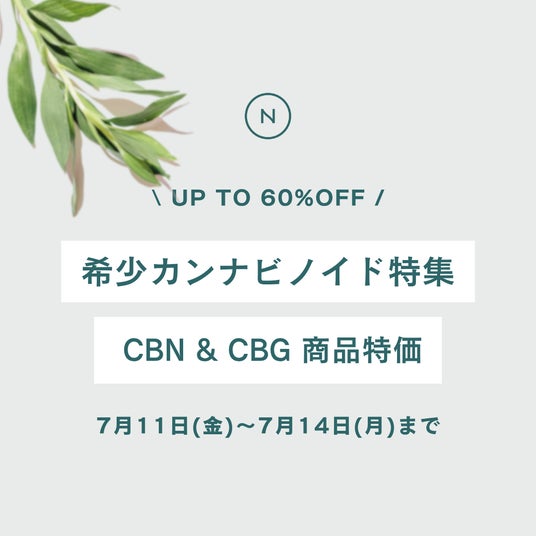 CBNとともに希少カンナビノイドとして知られるCBG(カンナビゲロール)を含む商品が、最大60%OFFのお買い得価格に。