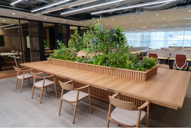 ワンフロアからなる空間で、社員やここに集う人々の間でオープンで活発なコミュニケーションが生まれることを期待して、仕切りや壁をできるだけ無くした設計となっています。床や壁、インテリアは当社のコーポレートブランドカラーを意識した落ち着いた色調で統一しており、観葉植物等グリーンも多く取り入れています。
