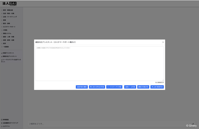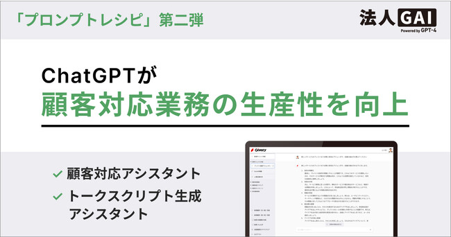 法人・行政向け業務改善ツール、AIチャットボット、AI-FAQなどを提供する株式会社ギブリー(本社:東京都渋谷区、代表取締役社長:井手高志、以下当社)は、「法人GAI powered by GPT-4(法人・ジーエーアイ、以下法人GAI)」に、具体的な業務シーンに対応した指示をワンクリックで可能とするプロンプトレシピの第二弾としてカスタマーサポート職向けの「顧客対応アシスタント」と「トークスクリプト生成アシスタント」の提供を開始したことをお知らせします。
