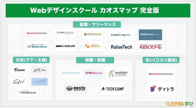 このように、IT・Webスキルを学べるスクールの注目度が上がっていることを受けて、「ミツカル学び」はWebデザインスクールのカオスマップを作成しました。