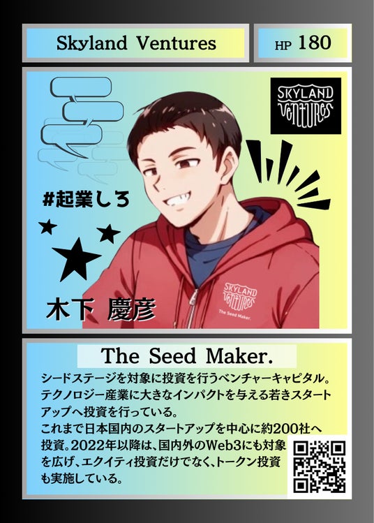 Skyland Ventures(本社:東京都渋谷区、General Patner・CEO:木下慶彦、以下SV)は、Skyland Ventures Trading Card (SVトレカ)を公開したことをお知らせします。SVトレカは、画像生成AI技術に強みを持つスタートアップである株式会社G-VIS(CEO:中山宗哉)の技術サポートにより実現されました。