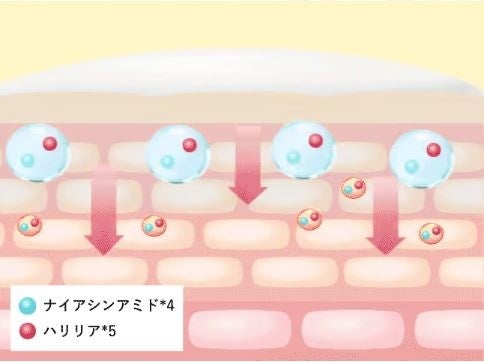 *4 角質層まで *5ナイアシンアミドとハリリアのW浸透処方において日本初採用 *6 シワ改善・美白 *7 ハトムギ発酵液、サンゴ草抽出液、アスパラサスリネアリスエキス(全て整肌)