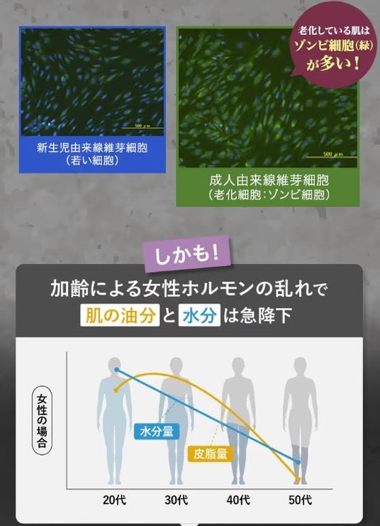 さらに、加齢による女性ホルモンの乱れで肌の油分と水分は急降下します。乾燥していると、ゾンビ細胞の攻撃が強くなってしまうのです。