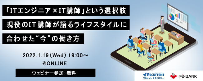 ITエンジニアの新しい働き方を提案する株式会社PE-BANK(東京都港区/代表取締役 高田 幹也)は、2022年1月19日(水)19時より、「ITエンジニア×IT講師」というキャリアについて、やりがいや様々な疑問を解消できるオンラインセミナー『「ITエンジニア×IT講師」という選択肢~現役のIT講師が語るライフスタイルに合わせた“今”の働き方~』を開催いたします。
