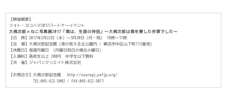 そのパートナーイベントの1つとして、2月22日より、猫を愛した作家、大佛次郎の記念館で『大佛次郎×ねこの写真展 2017』を開催します。展示は4つのテーマごとに展示されます!