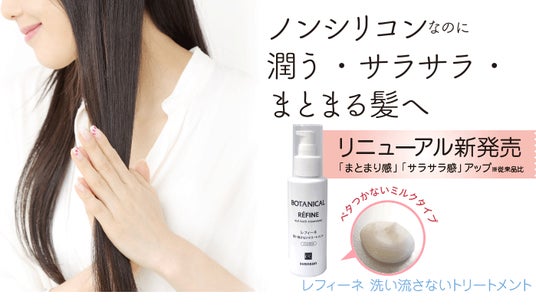 「レフィーネ 洗い流さないトリートメントメント」は、「レフィーネ」が厳選する保湿・補修成分を配合したノンシリコンタイプの洗い流さないトリートメントです。髪悩みに多い髪のパサつきやうねり、広がりなどに潤いとツヤを与え、指通りのよいまとまりある髪に導きます。