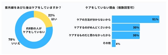レフィーネ公式オンラインストア内にて、30~80歳の男女602名を対象に行った紫外線ケアについてのアンケートの結果によると、「紫外線による髪や頭皮のトラブルで知っているものはありますか?」という質問に対し、74%が「髪のパサつき」と回答したにも関わらず、紫外線をあびた後のケアをしているという人は22%と低い結果に。約8割の人が、「ケアの方法が分からないから」や「ケアするものだと思っていなかった」などを理由に、紫外線によるダメージケアをしていないことが分かりました。