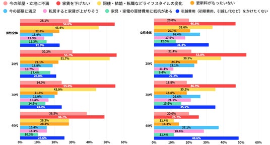 男女ともに更新派が7割以上で、特に40代男性では絶対更新する人が43.6%と、住み慣れた環境での暮らしを継続したいという意向が予想されます。対して転居希望者では20代女性が31.6%とやや高い傾向で、男女ともに20,30代の方がライフスタイルの変化や、現在の住環境をより良いものにしたいというステップアップ思考が感じられます。
