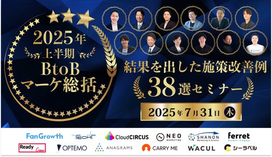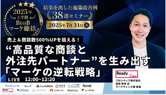 ビジネスマッチングサービス「Ready Crew(レディクル)」を運営する、フロンティア株式会社(本社:東京都渋谷区、代表取締役社長:高橋 政裕、以下 当社)は、2025年7月31日に開催される、「2025年上半期BtoBマーケ総括 結果を出した施策改善例38選」セミナーに登壇致します。