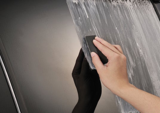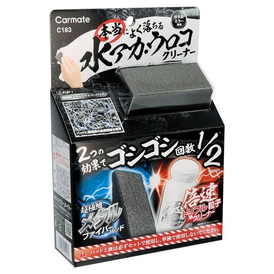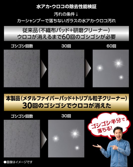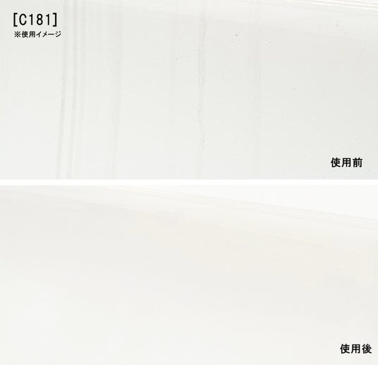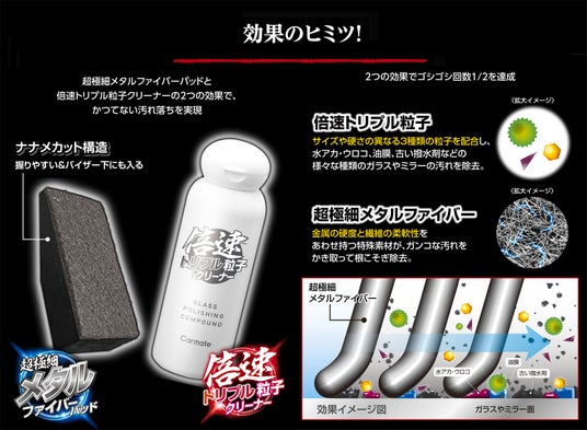 サイズや硬さの異なる3種類の粒子を配合し、水アカ・ウロコ、油膜、古い撥水剤などの様々な種類のガラスやミラーの汚れを除去します