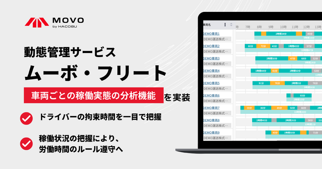 株式会社Hacobu(ハコブ、本社:東京都港区、代表取締役社長CEO 佐々木太郎、以下「Hacobu」)は、動態管理サービス「MOVO Fleet(ムーボ・フリート)」に、車両ごとの稼働実態を簡単に確認できる機能を実装いたしました。