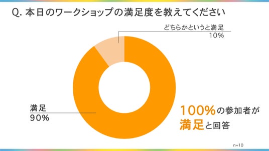 満足度では、90%が「満足」、10%が「どちらかというと満足」と回答し、参加者全員が肯定的な評価を寄せました。