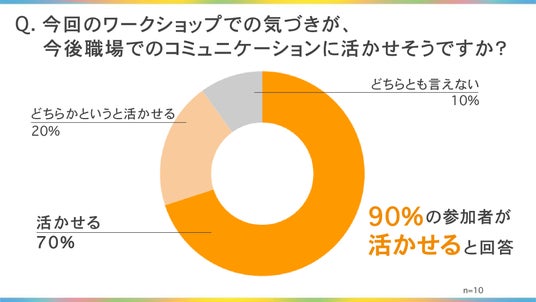 アンケートでは、70%が「活かせる」、20%が「どちらかというと活かせる」と回答し、合計で90%の参加者が職場での活用意欲を示しました。今回のワークショップが、実務や日常のコミュニケーション改善に直結する手応えを感じたことがうかがえます。