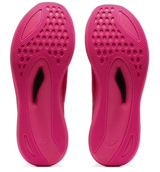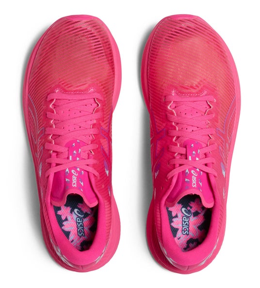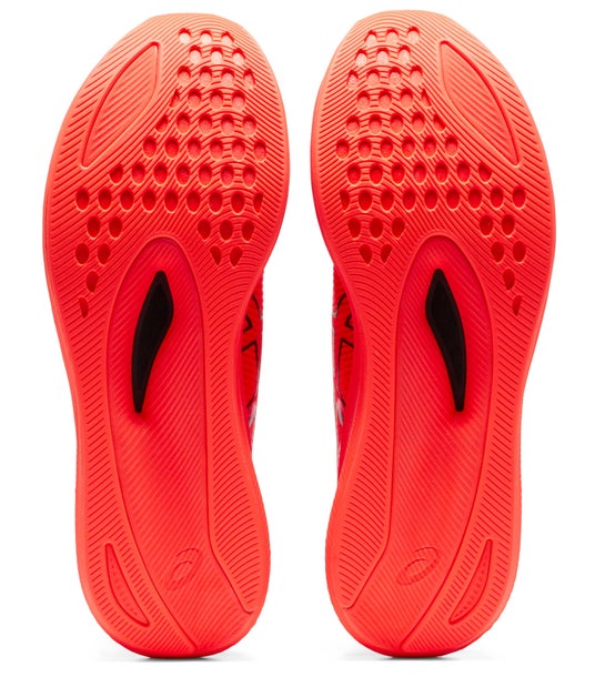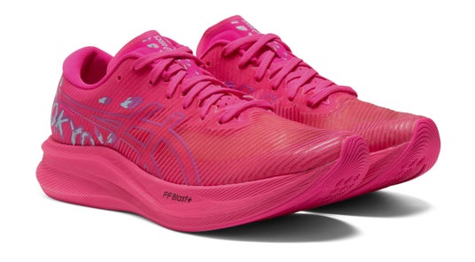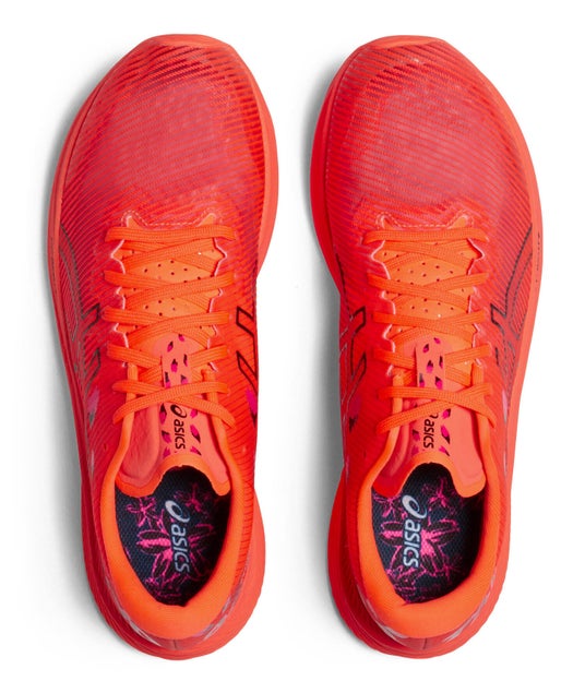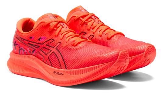 「MAGIC SPEED 3」は、よりスムーズで推進力のある走りを生み出すカーボンプレート搭載のランニングシューズです。カーボンプレートをミッドソール(甲被と靴底の間の中間クッション材)の前部から後部にかけて搭載し、蹴り出し時の足の動きを安定させ、効果的に身体を前方向へ推進させるようにしたのが特徴です。アッパー(甲被)は、軽量で通気性が良く、優れたキックバック特性をもつ「モーションラップアッパー」を採用し、アッパー内側とベロ部をつなげた構造にすることで足とシューズの一体感、フィット性を向上させています。靴底は、さまざまな路面コンディションでも優れたグリップ力を発揮する「ASICSGRIP」を採用しています。また、かかと部の接地面積を広げることで着地時の足元のブレを抑制し、安定した足運びをサポートします。ミッドソールは、全面に軽量で反発性に優れたクッションフォーム材「FF BLAST PLUS(エフエフブラストプラス)」を採用し、軽量でやわらかなクッション性を実現しています。フルマラソンでパーソナルベスト更新を目指すランナーや新たにカーボンシューズを試したいランナーのほか、インターバル走などのスピードトレーニング用としてもおすすめです。