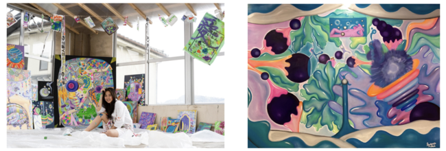 10代の頃に夢中になって取り組んだサーフィンを通して、自然と対話をしてきた経験が作品に生かされ、頭で考えず、本能に身を委ねて描くスタイルは、唯一無二の気持ちの良い色彩ができあがる。