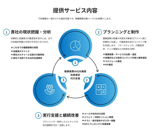 健康施策・外部健康サービスの比較・選定、拠点・階層・従業員の健康リテラシー等に応じたセグメンテーション、健康施策の意義や内容を対象者セグメントごとに効果的に伝達し、行動変容を促すコンテンツ等作成と適切な情報伝達媒体の選定の他、スケジュール策定、KPI設定など