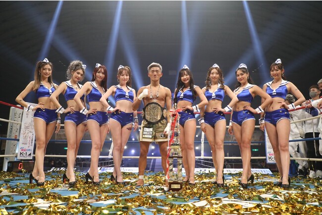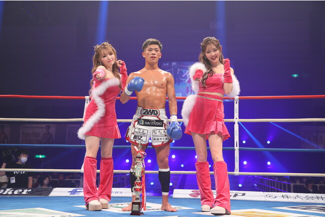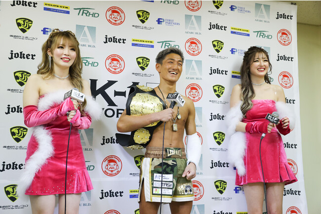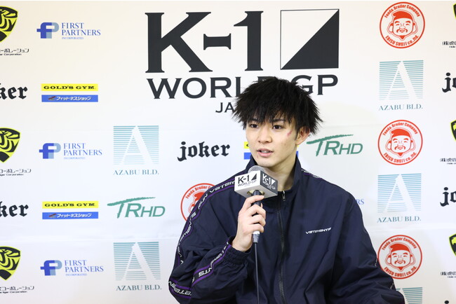 斗麗選手に試合の感想を伺うと、「強い対戦相手だと予めわかっていたので気合を入れて練習しました。無事に勝ててよかったです。」と安堵の表情で勝利の喜びを語りました。また、K-1スペシャルラウンドガールを努めたお二人については「めっちゃ可愛くて緊張しました。ゆうちゃみさんは身長も高くて、僕もヒールが欲しかったです(笑)」と少し恥ずかしがりながら答えました。