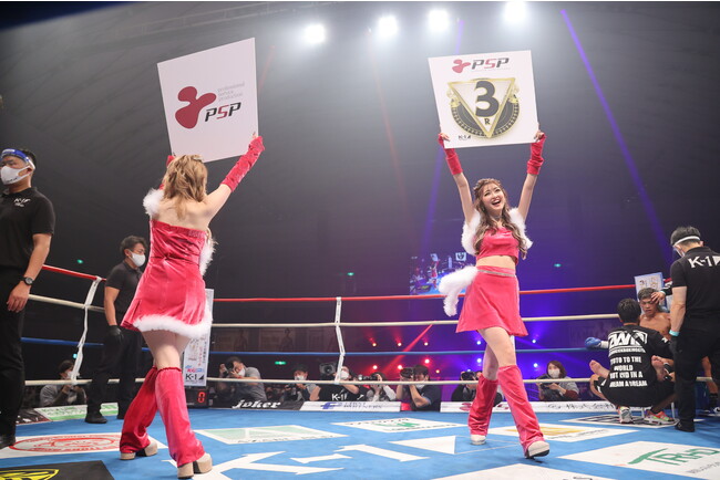 姉妹での初リング、スペシャルラウンドガールでラウンドを披露したお二人に感想を伺うと、ゆうちゃみさんは「ひとりでは先日の大会でやらせていただいたんですけど、姉妹では初めてで、衣装もめちゃめちゃ可愛いんですよ。もう少しでクリスマスなので、可愛いピンクのサンタコスでそろえました。楽しかったです!」、ゆいちゃみさんは「迫力の試合を目の前にめっちゃ緊張したけど、お姉ちゃんと一緒に一生懸命頑張りました!」と仲睦まじく笑顔でラウンドを振り返りました。今回の衣装のポイントについて伺うと、ゆうちゃみさんは「ストーンがいっぱい付いていて、肩出しやファーのところもギャルっぽくて可愛い!」と述べました。