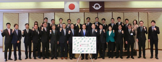 2026年1月29日に開催された連携会議において、セレモニーを実施しました。セレモニーでは、山口県の決意表明の標語である「MADE IN JAPANの復権は山口県から」を中央に掲げ、会議に出席した自治体および企業等のロゴをあしらった葉を配置したボードを制作。自治体・企業等の代表者が同ボードを囲み、記念撮影を行いました。