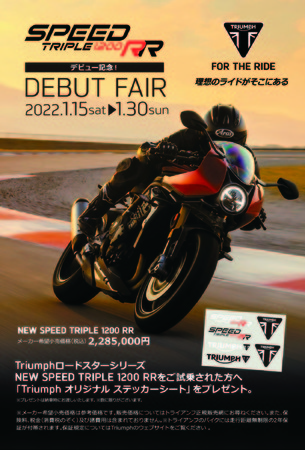 トライアンフモーターサイクルズジャパン株式会社(代表取締役:大貫陽介、東京都港区)は、新しくデビューしたSpeed Triple 1200RRのデビューフェアを2022年1月15日(土)~ 1月30日(日)までの期間中、全国のトライアンフ正規販売店にて開催することをお伝えいたします。