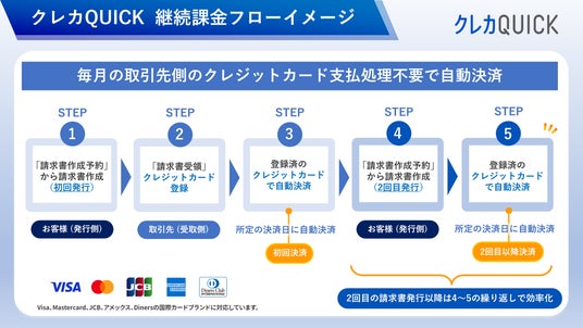 当社は、月額無料から使えるクラウド型請求書管理システム「請求QUICK」に、クレジットカード決済機能「クレカQUICK」を標準搭載しております。「請求QUICK」で発行した請求書を受け取ったお取引先が、お支払いの都度かんたんにクレジットカードで決済できる便利な機能で大変ご好評いただいております。本機能をご利用のお客様より、「月額利用料などの定期請求はクレジットカードで自動引き落としできるようにしてほしい」との声が寄せられたことから、このたびの継続課金機能の提供に至りました。