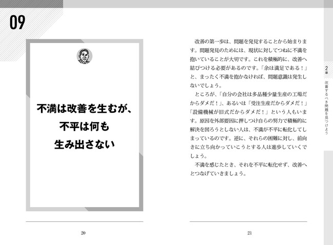 改善を始める事前準備、実際に改善を行うための考え方、自分だけでなく周囲の人にも改善を促すための意識の高めかたなど、現場改善を実際に進めている人はもちろん、これから現場改善に取り組む方にも役に立つ言葉を集めています。新郷氏のユーモアあふれる言葉で、読むだけで現場改善の考え方が身に付きます。