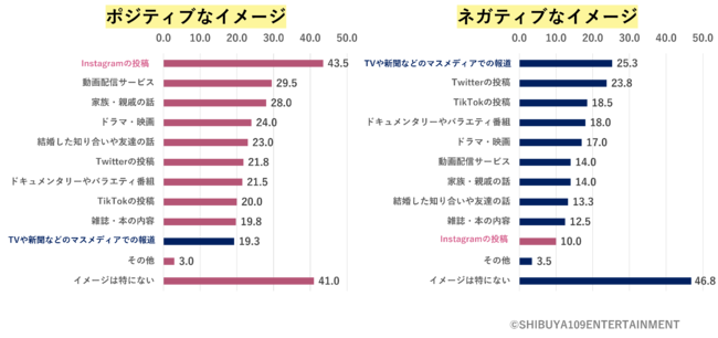 最後に、結婚や子育てに関して、どのような情報によって「ポジティブ・ネガティブなイメージ」をそれぞれ持っていると思うか※図13、メディアごとに見たところ、それぞれ真逆のメディアが該当し、ポジティブなイメージは「Instagramの投稿」(43.5%)や「動画配信サービス」(29.5%)、ネガティブなイメージは「TVや新聞などのマスメディアの報道」(25.3%)、「Twitter」(23.8%)から取得していることがわかります。